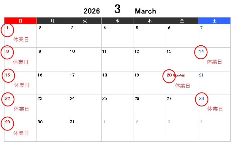 3月の休業日ご案内いたします